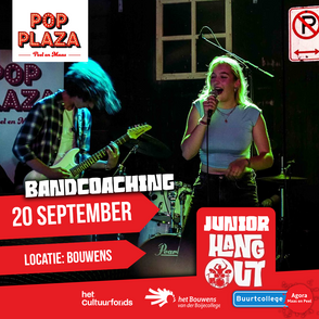 De Junior Hangout is een bijeenkomst bij onze middelbare school in de buurt voor jongeren waar ze workshops kunnen volgen en samen muziek kunnen maken.