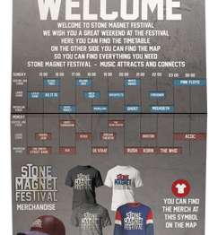 Tijdens mijn opleiding werkte ik ook aan een fictief festivalconcept: Stone Magnet Festival – een rock/metal festival voor alle soorten rock- en metalheads. De naam verwijst naar 'steen' en 'metaal', en symboliseert de verbinding tussen deze genres én de mensen die ze samenbrengen. Voor deze opdracht ontwikkelde ik het volledige concept, inclusief doelgroepbepaling, logo, huisstijl, poster, ticket, folder, plattegrond, polsbandje, merchandise en een teaser.